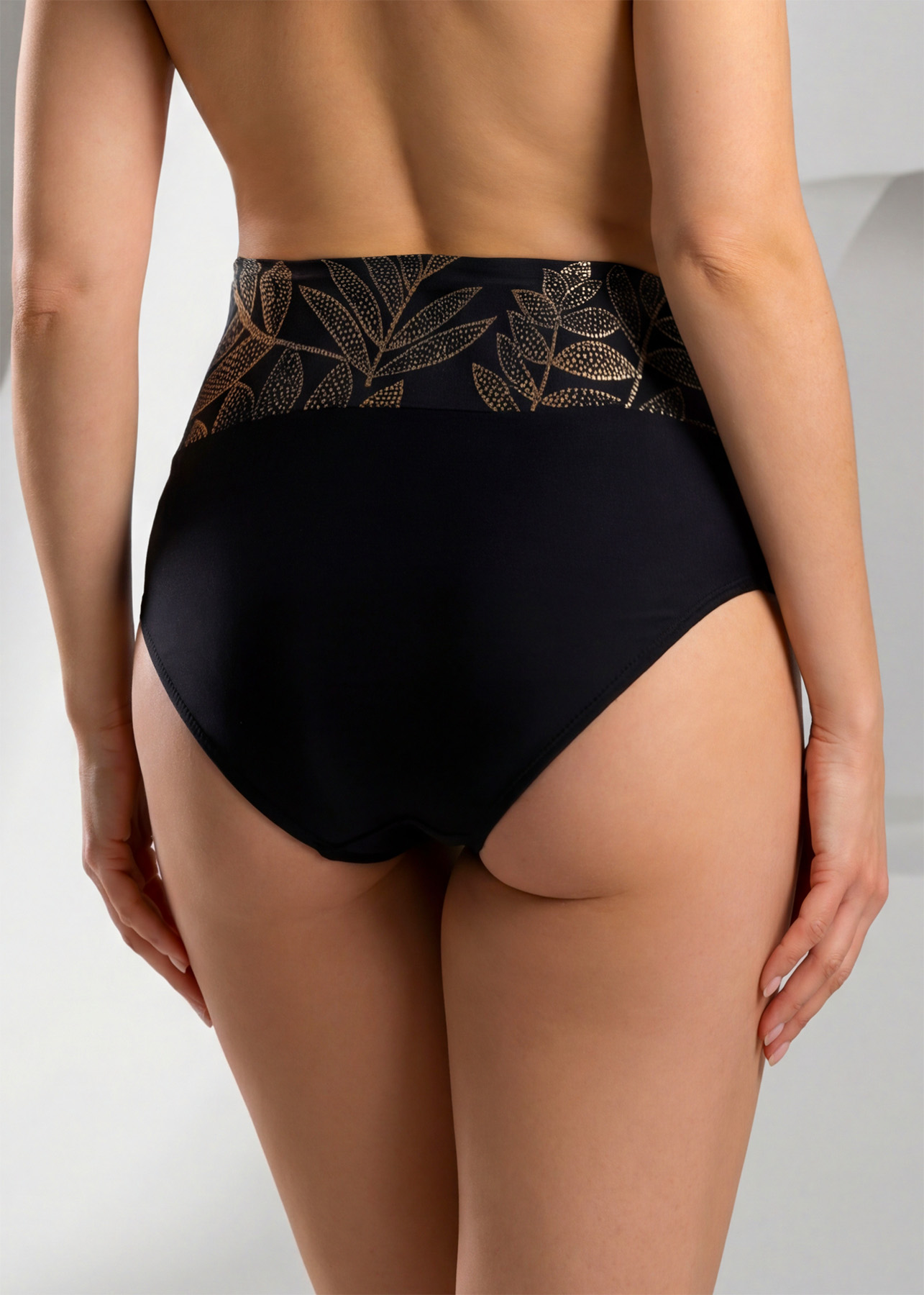 Wiemy, że każda z nas ma dni, kiedy chce ukryć odrobinę więcej. Wersja z odwiniętym pasem działa jak luksusowa bielizna korygująca. Materiał delikatnie, ale stanowczo opina strefę brzucha, wygładzając fałdki i maskując ewentualne niedoskonałości. To idealne rozwiązanie, jeśli szukasz stroju kąpielowego zakrywającego brzuch i boczki, który jednocześnie wygląda zmysłowo i lekko. Złoty, mieniący się w słońcu motyw roślinny na czarnym tle dodatkowo „oszukuje oko”, wysmuklając optycznie biodra.
