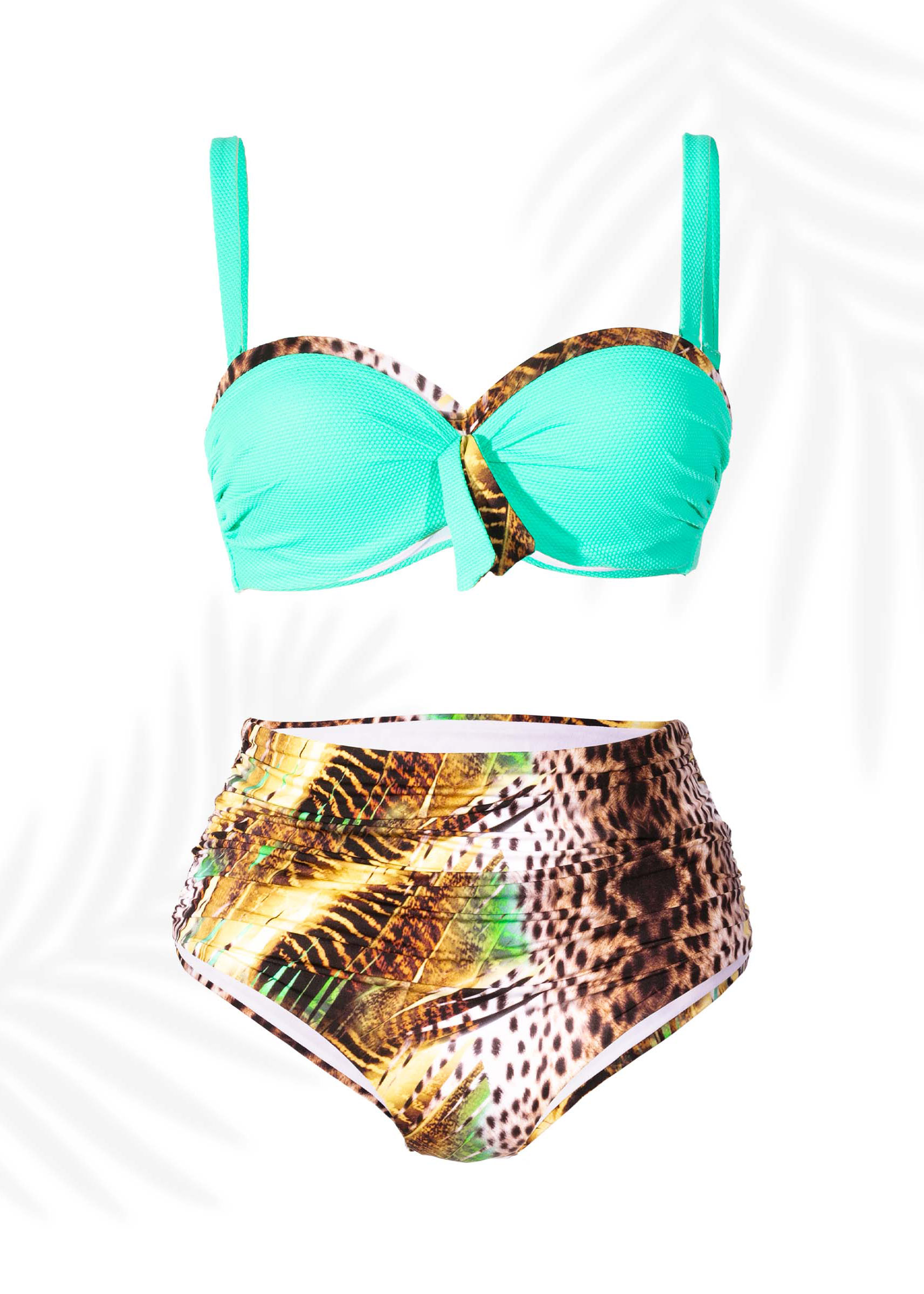 Miętowy kostium kąpielowy Abi / F11 z wysokim stanem to prawdziwe cudo. Jego górna część przypomina stylowy top z delikatnym motywem zwierzęcym. Fiszbiny i wyjmowane wkładki push-up podkreślają biust, a delikatne falbanki dodają uroku. Dolna część to majtki o wysokim stanie, które doskonale modelują sylwetkę i zakrywają pośladki. Kostium łączy w sobie dwie odrębne części, które razem tworzą zjawiskowy efekt. Miseczki biustonosza oraz fiszbiny umieszczone w miękkiej kieszonce gwarantują wygodę nawet najbardziej wrażliwym obszarom ciała.