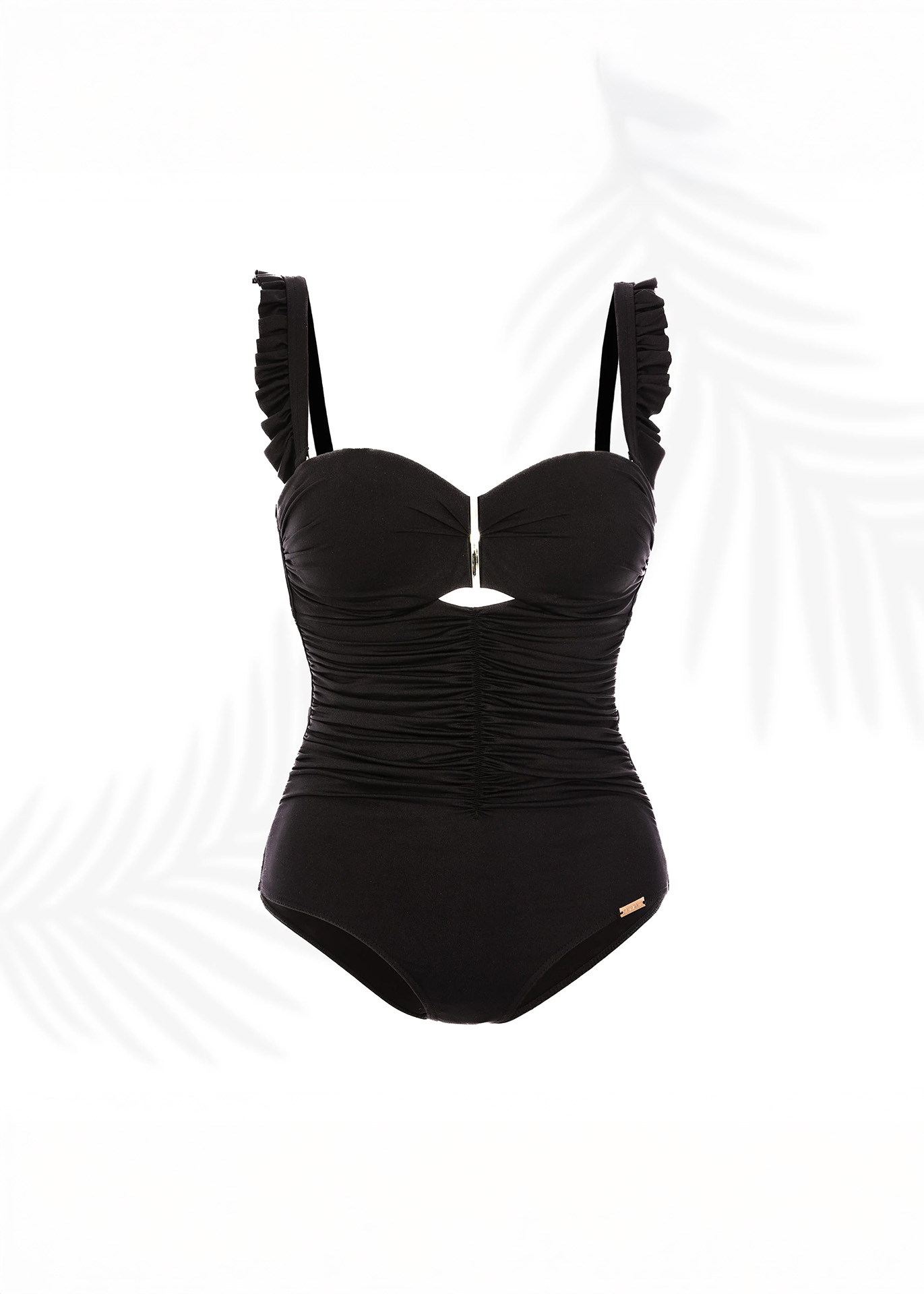 Jednoczęściowy strój kąpielowy Anastazja O wyróżnia się delikatnymi marszczeniami od bioder po linię biustu oraz pionowym przeszyciem pośrodku, które zaznaczają talię i wysmuklają sylwetkę. Majtki z wysokim stanem zakrywają pośladki. Górna część kostiumu nawiązuje do biustonosza typu bardotka. Odpowiednio wyprofilowane miseczki z fiszbinami i wkładkami push-up, delikatne marszczenia oraz złota ozdoba pomiędzy piersiami genialnie eksponują biust. Wyjmowane wkładki push-up pozwalają na dopasowanie stroju do piersi w każdym rozmiarze. Fiszbiny umieszczone w dobrze zabudowanej, miękkiej kieszonce zapewniają komfort wrażliwym obszarom ciała. Falbanki na ramiączkach oraz efektowne wycięcie pod biustem dodają kokieterii. Anastazja O to model typu dwa w jednym – dodatkowa para klasycznych ramiączek sprawia, że w kilka minut odmienisz swój wizerunek. Są wyposażone w regulację umożliwiającą idealne dopasowanie stroju do sylwetki. Aby uzyskać równomierną opaleniznę, wystarczy je odpiąć. Zapięcie z tyłu na zatrzask dodaje pewności siebie nawet podczas zabawy wśród morskich fal.