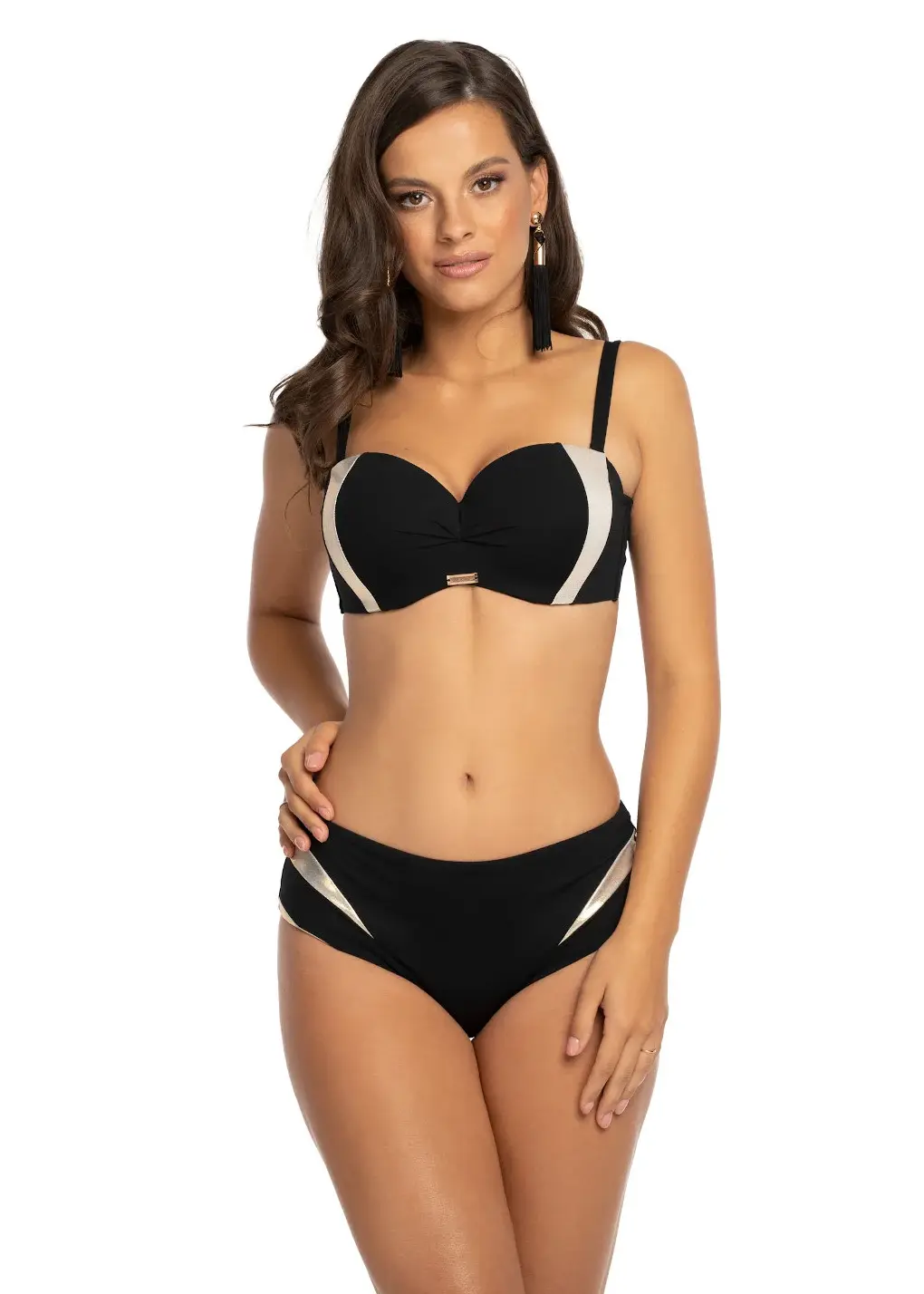 Niekwestionowana klasyka i elegancja zagościły w najnowszej linii Glamour. Dzięki nim zawsze będziesz wyglądać modnie. Kostiumowi Beti blasku i szlachetności dodają wstawki w kolorze złota. Struktura tkaniny sprawia, że intensywność czerni zostaje zachowana, gdy stosujesz olejek do opalania, kąpiesz się w morzu lub basenie. Fason z biustonoszem bardotką to doskonałe rozwiązanie dla kobiet pewnych siebie, którym zależy na podkreśleniu swojego wdzięku.
