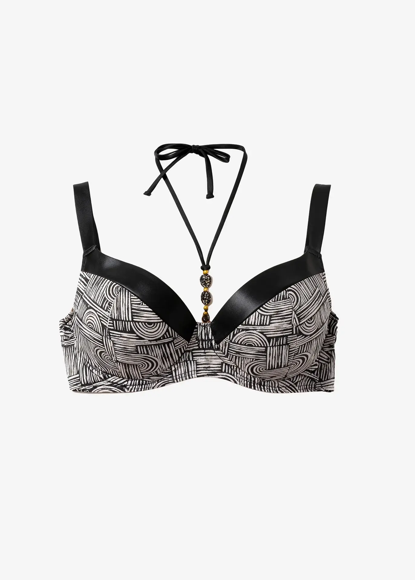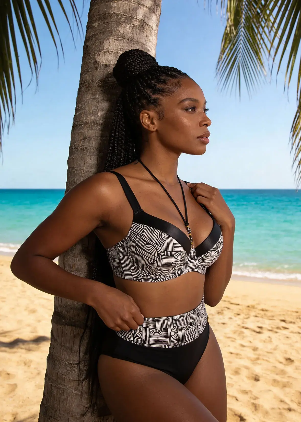 Biustonosz kąpielowy LB-018-158 z kolekcji Fiji Paradise powstał z myślą o kobietach, które oczekują od góry bikini czegoś więcej niż tylko ładnego wyglądu. Ten model łączy elegancką czerń z wyrazistym printem w odcieniach czerni i ecru, tworząc nowoczesny, wysmakowany efekt na plaży i przy basenie. To góra bikini, która pięknie modeluje biust, nadaje mu pełniejszy kształt i pozwala Ci poczuć się pewnie niezależnie od rozmiaru miseczki.