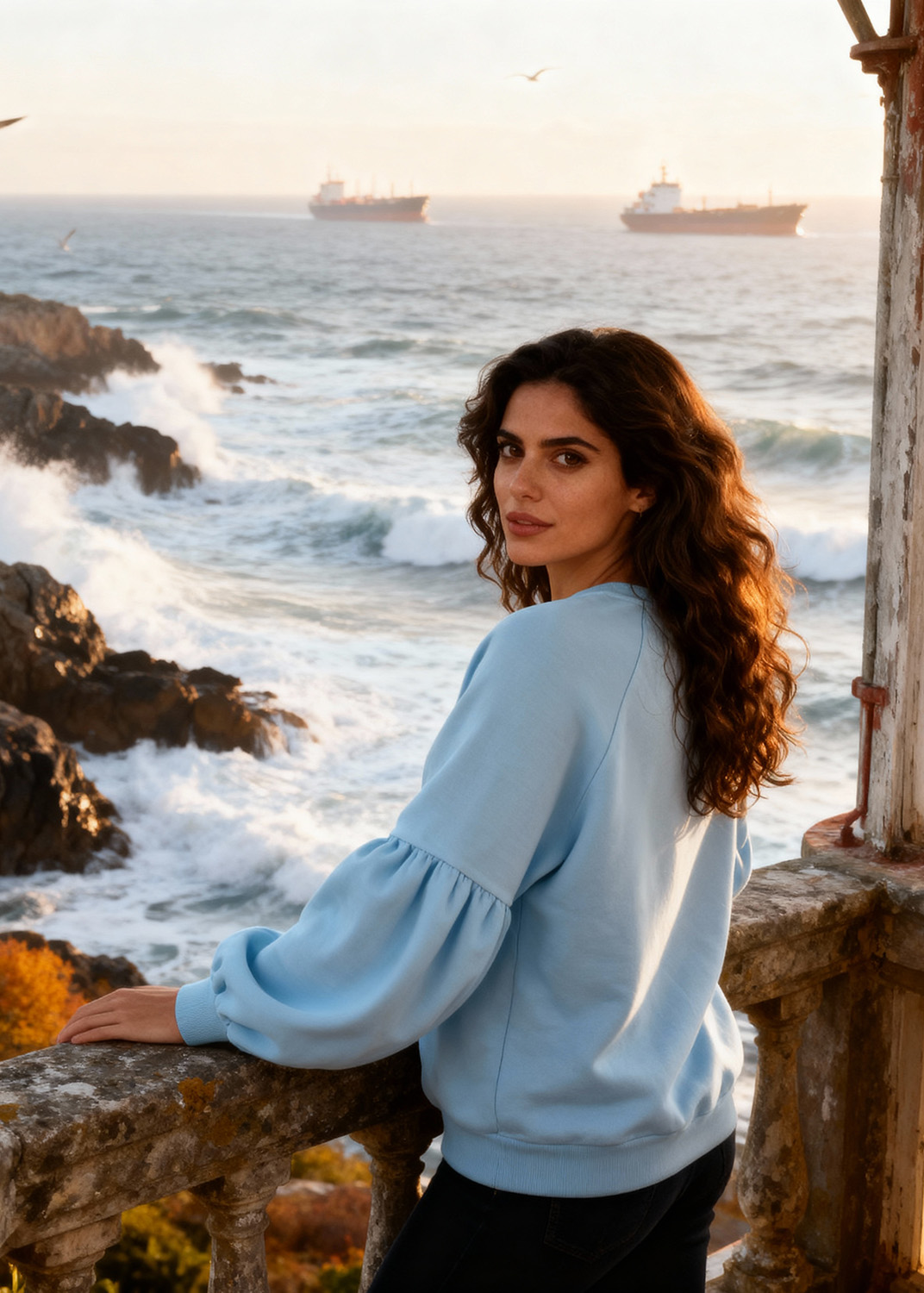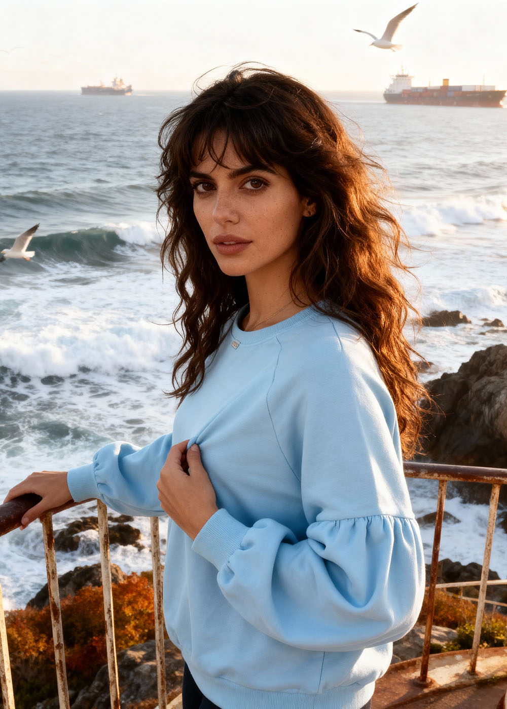 Oryginalny, intrygujący krój rękawów sprawia, że bluza może być eleganckim uzupełnieniem casualowej stylizacji. Wykończenie rękawów i dołu bluzy ściągaczem zapewnia komfort użytkowania, a umieszczona pod dekoltem dyskretna blaszka w złotym kolorze z logo dodaje klasy i elegancji. Kolor pogodnego nieba budzi przyjemne skojarzenia i doskonale wygląda przy ciemnych spódnicach i spodniach.