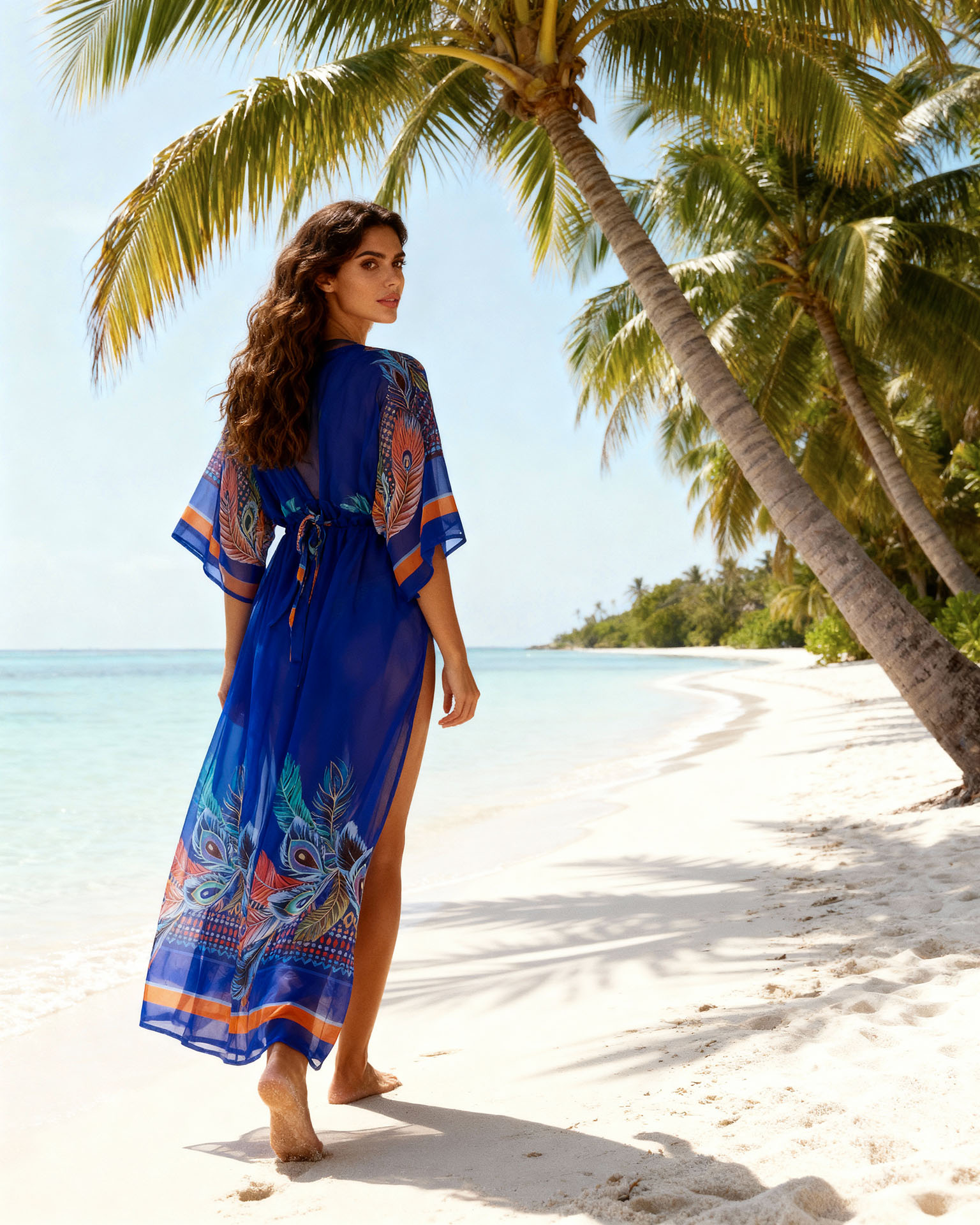 Zanurz się w oceanie elegancji z naszą granatową narzutką plażową. To nie tylko okrycie – to prawdziwe dzieło sztuki, które przemieni Twój plażowy look w stylizację godną ekskluzywnego resortu. Egzotyczny wzór pawich piór na głębokim granatowym tle przypomina tajemnicze głębiny oceanu, a pomarańczowe akcenty rozświetlają całość niczym zachodzące nad horyzontem słońce. Odcień królewskiwgo bękitu sprytnie podkreśli ciepło Twojej opalenizny.