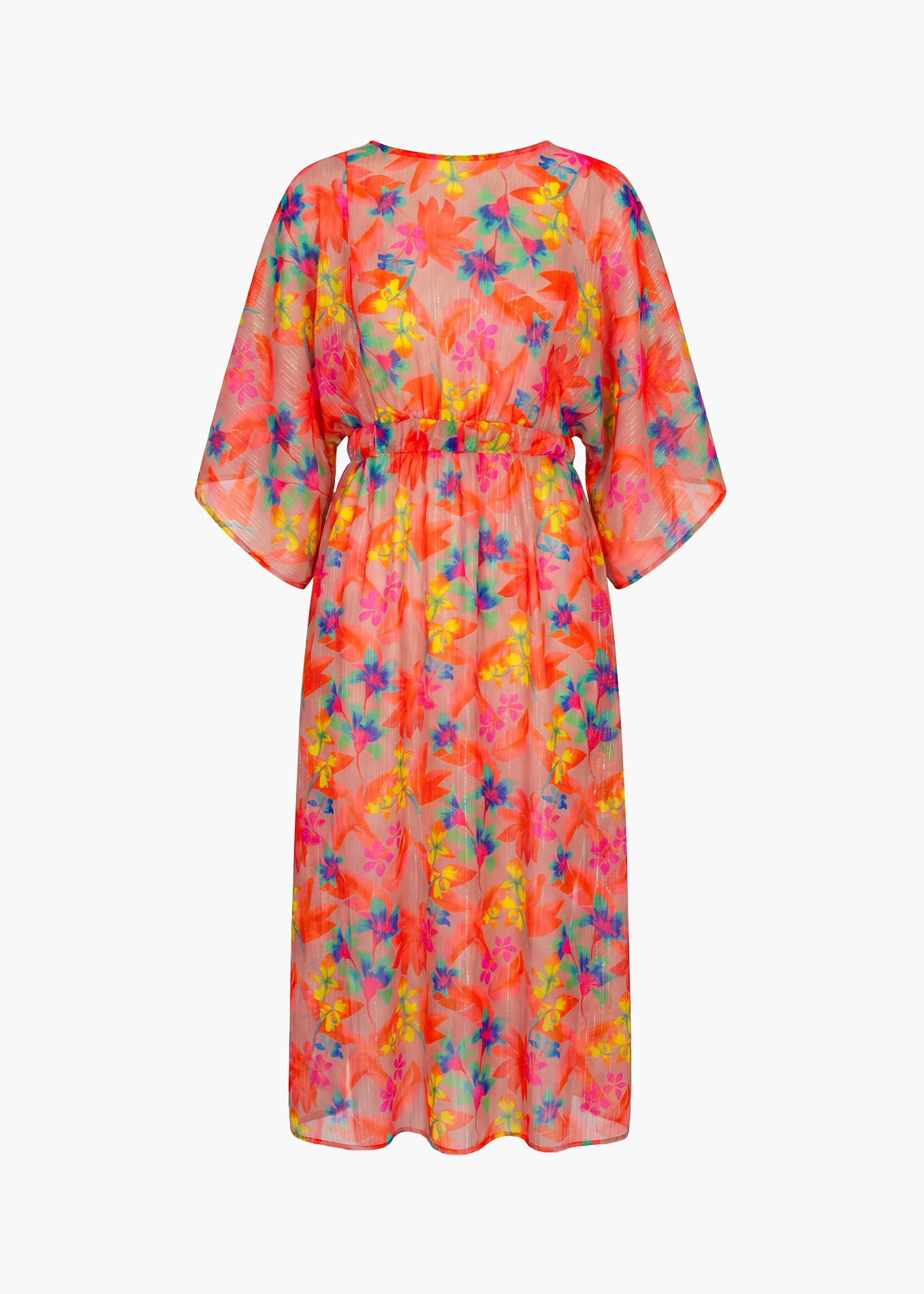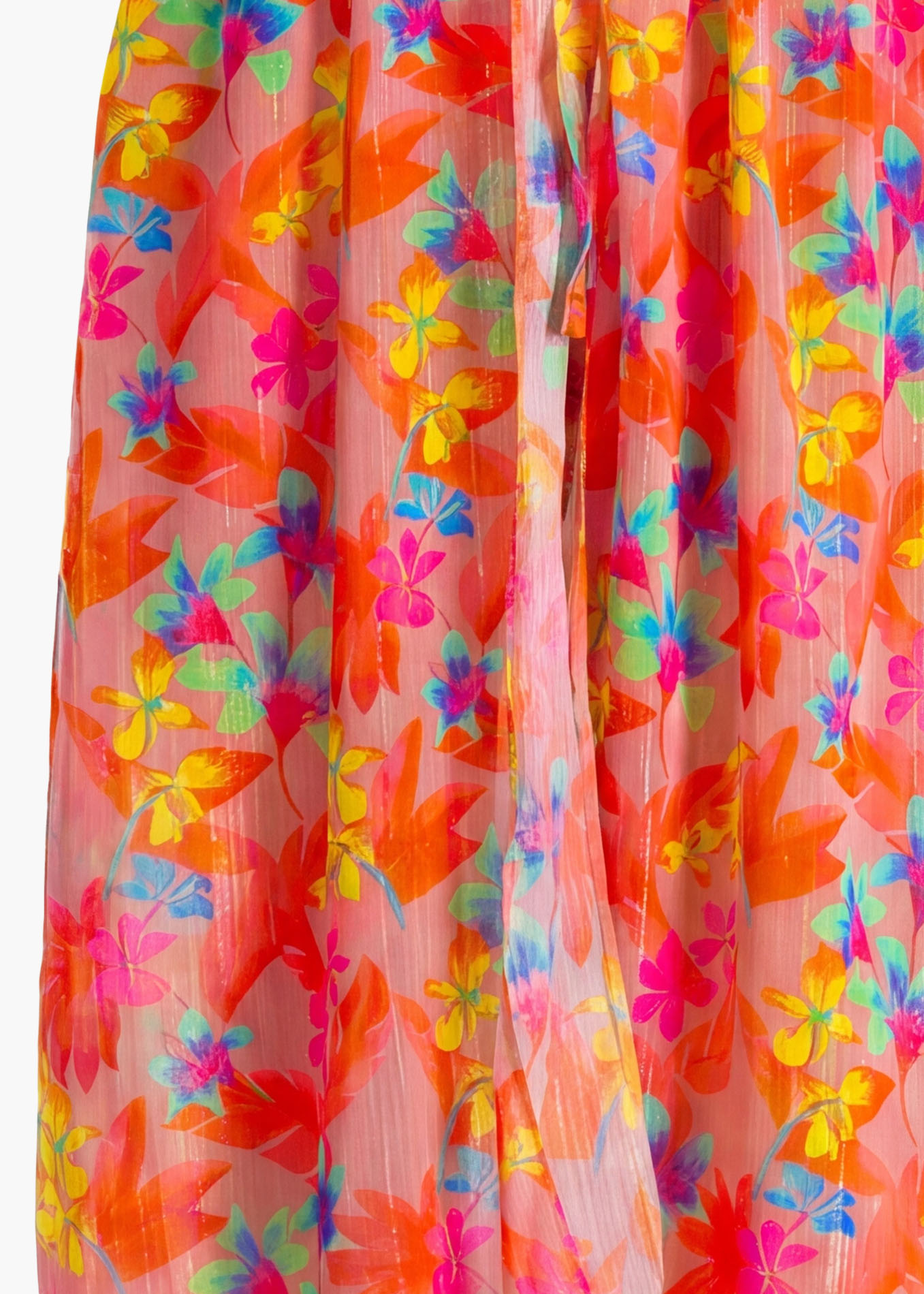 Neonowe akcenty na koralowym tle to jak zachód słońca w tropikach! Kwiatowe printy przeplatają się z delikatną, połyskującą nitką, tworząc hipnotyzujący efekt, który doskonale podkreśli każdą wakacyjną opaleniznę. To jak nosić na sobie kawałek egzotycznego ogrodu!