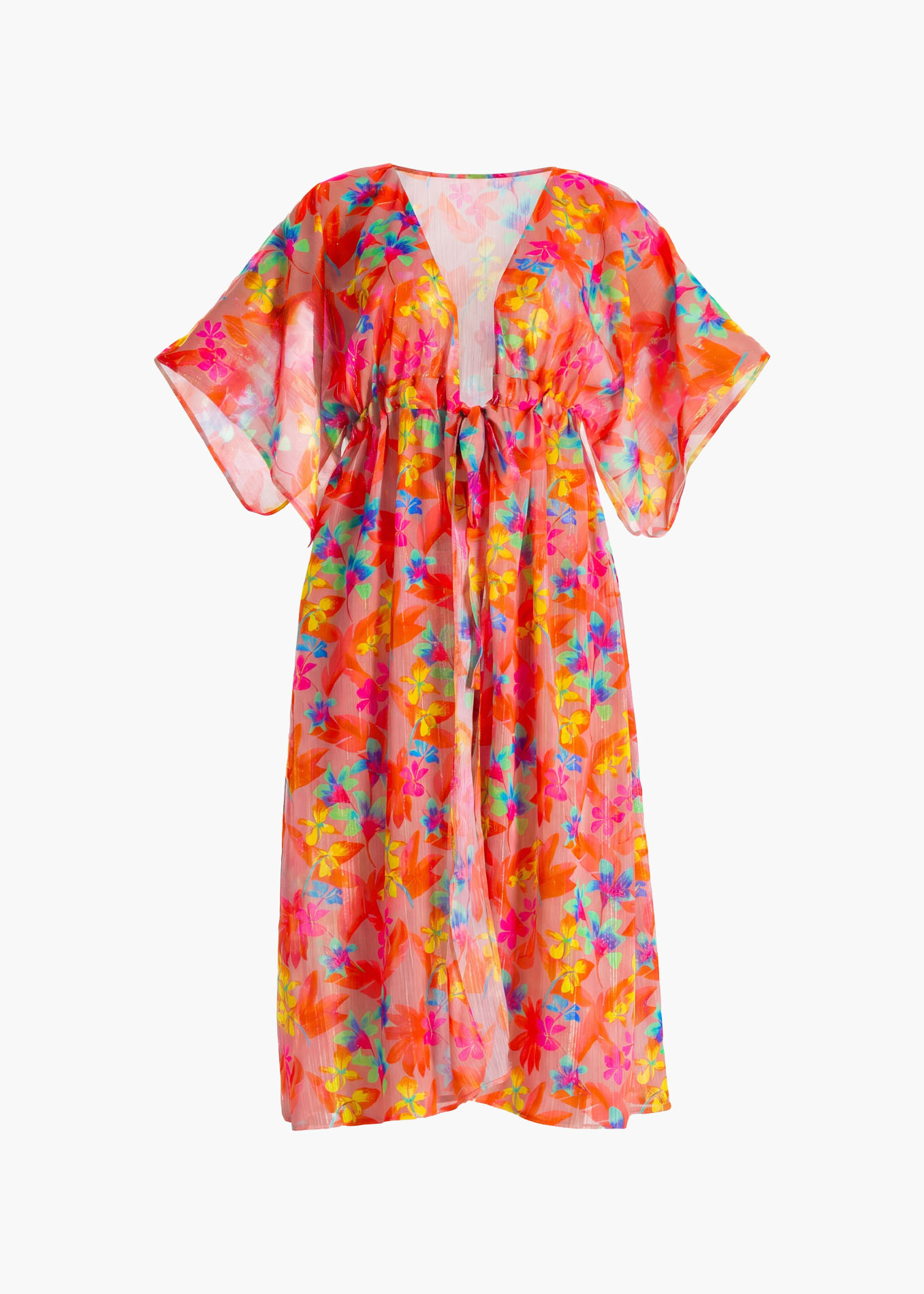 Zanurz się w ocean możliwości stylizacji z naszą zjawiskową narzutką plażową! Niczym morska bryza, lekki i zwiewny materiał otuli Twoją sylwetkę, dodając każdej stylizacji plażowej niepowtarzalnego uroku. Koralowe odcienie przełamane neonowymi akcentami kwiatów sprawią, że będziesz lśnić jak zachodzące słońce nad oceanem.