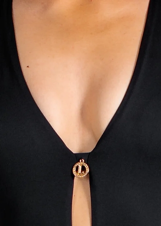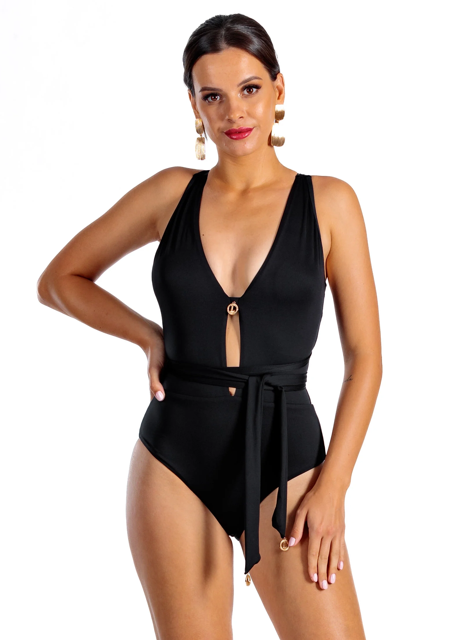 Czarny jednoczęściowy kostium kąpielowy z głęboki dekoltem