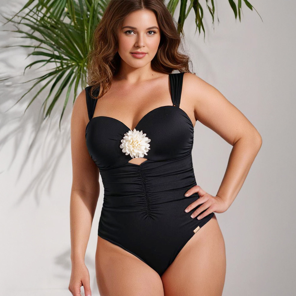 Poznaj kostium kąpielowy, który łączy w sobie luksus z funkcjonalnością! Ten wyjątkowy model w głębokiej czerni zachwyca eleganckim kwiatowym detalem i starannie przemyślaną konstrukcją modelującą. To propozycja dla kobiet, które pragną czuć się pewnie i wyglądać olśniewająco nad wodą.