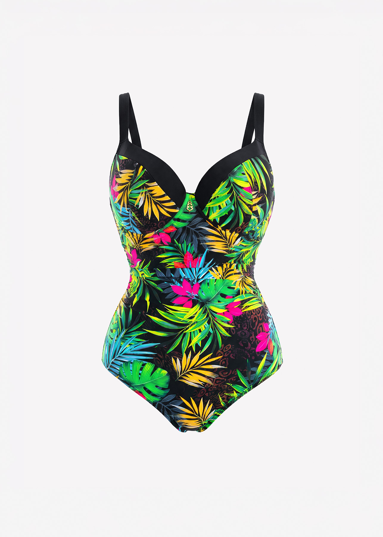 Modelujący jednoczęściowy kostium kąpielowy Leila od Lavel to doskonałe rozwiązanie dla Pań z dużym biustem, które poszukują wsparcia i komfortu. Bezpieczeństwo przy każdym ruchu zapewnia podwójne zapięcie na plecach, a szerokie, regulowane ramiączka gwarantują doskonałe podtrzymanie. Miękka miseczka piankowa w połączeniu ze stabilizującymi fiszbinami w miękkiej kieszonce oferuje wygodę i bezpieczeństwo, a modne roślinne wzory na tle ponadczasowej czerni to świetny wybór dla eleganckiego, plażowego looku.