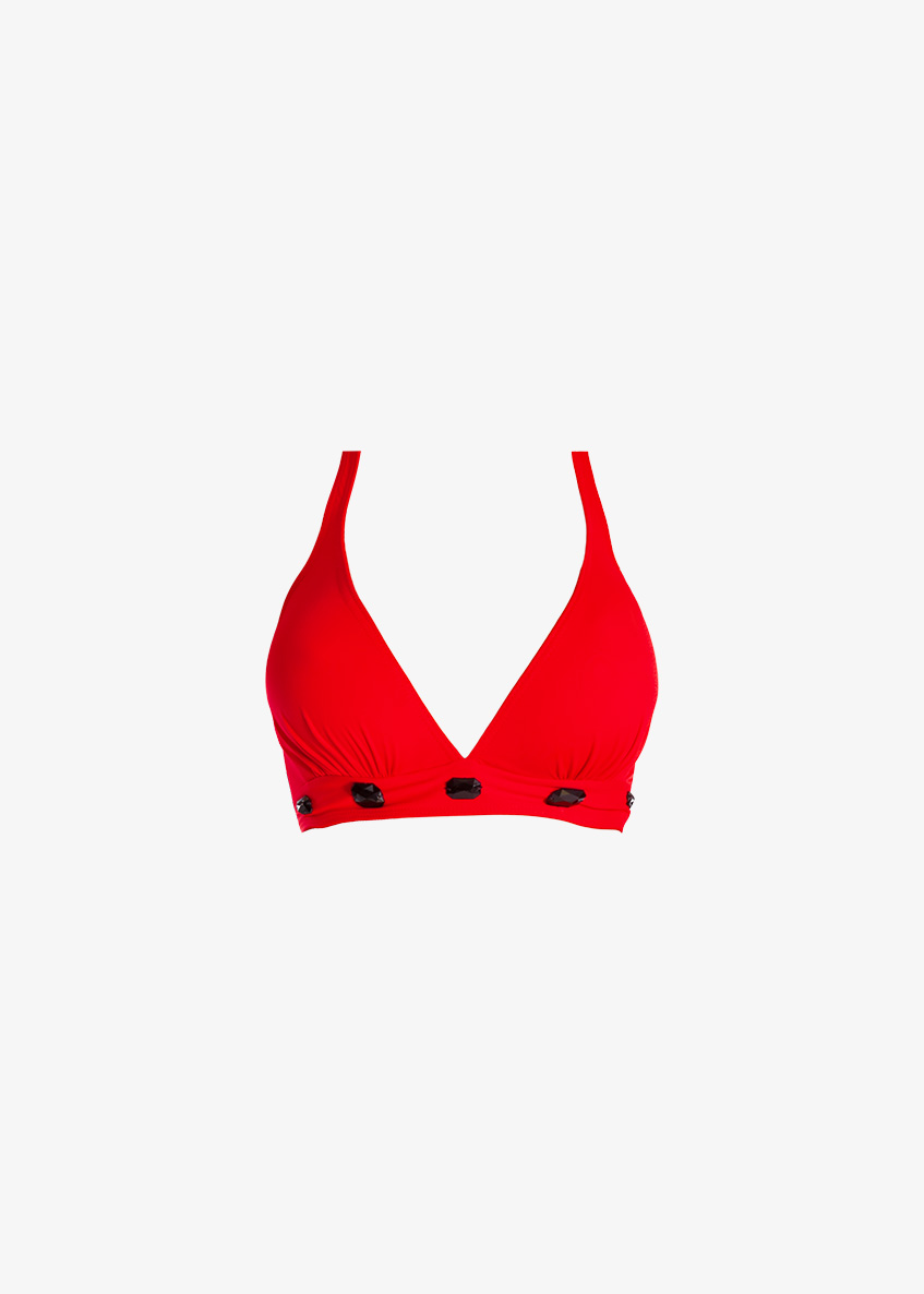 Czerwona góra bikini wiązana na szyi – luksusowy biustonosz z kryształkami