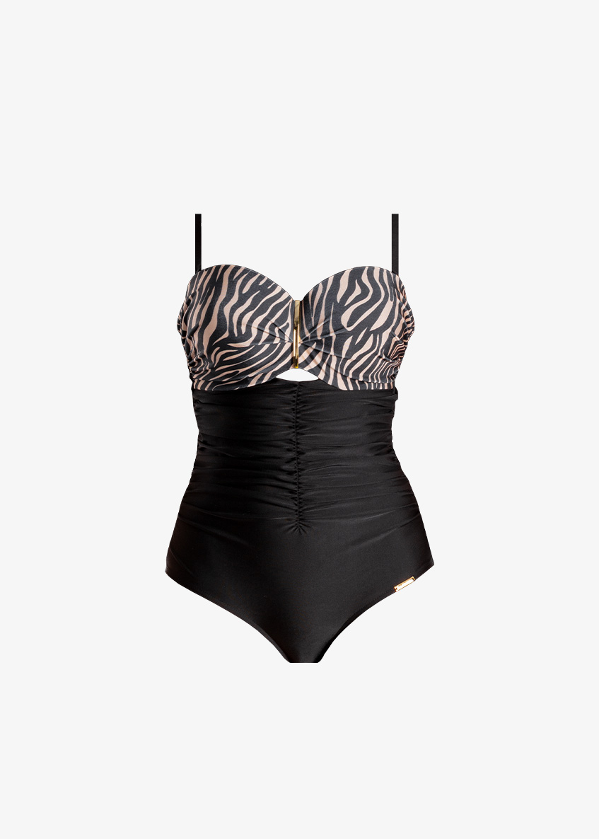 Czy Ty też czasem marzysz o stroju kąpielowym, który działa jak magiczna różdżka? Takim, który idealnie zbiera i podnosi biust, sprytnie maskuje brzuszek i sprawia, że czujesz się jak milion dolarów? Mam dla Ciebie dobrą wiadomość – właśnie go znalazłaś. Ten model to połączenie ponadczasowej czerni z drapieżnym wzorem zebry z naszej najnowszej kolekcji Dzika Brazylia. To nie jest zwykły kostium. To Twoja tajna broń na plaży, która modeluje sylwetkę i dodaje niewiarygodnej pewności siebie.