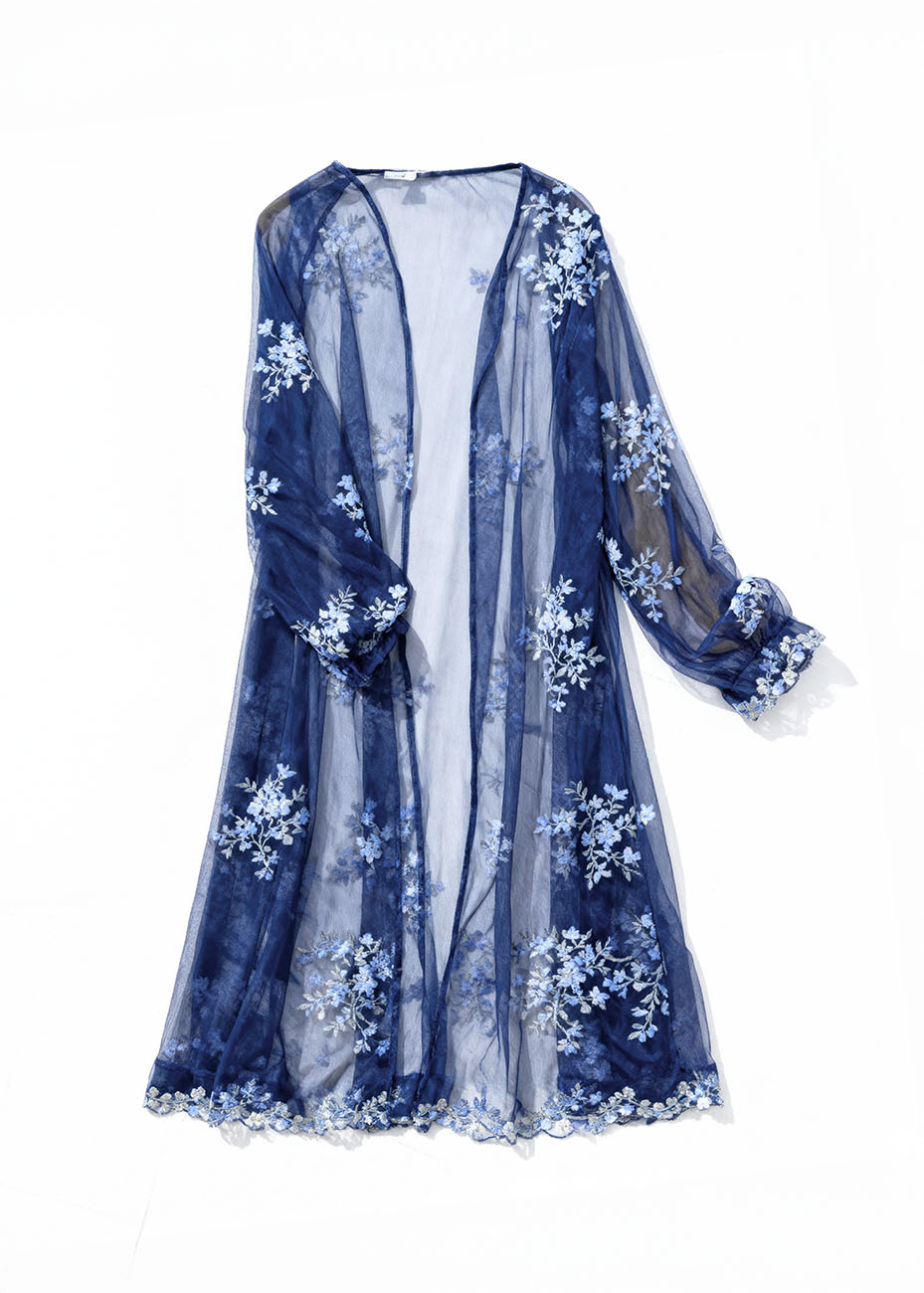 Odkryj magię letniego szyku z naszą zjawiskową tuniką plażową! Ten wyjątkowy model to prawdziwa perełka wśród plażowych okryć, łącząca w sobie delikatność z wyrafinowanym designem. Ażurowy haft w odcieniach granatu i błękitu tworzy na przezroczystym tle hipnotyzującą kompozycję kwiatową, która przyciąga spojrzenia i zachwyca subtelnością.