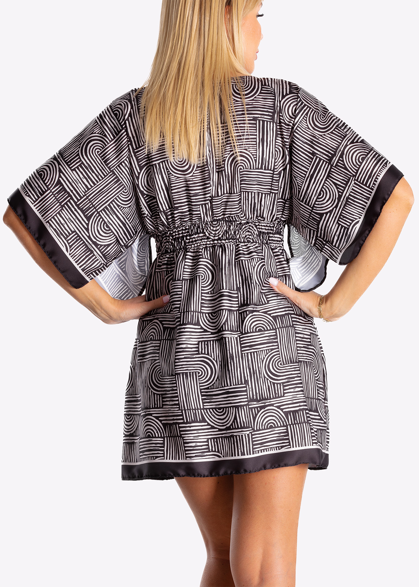 Sukienka plażowa LS-405-158 z kolekcji Fiji Paradise to lekka i efektowna narzutka na strój kąpielowy, która pozwala Ci w kilka sekund stworzyć dopracowany, kobiecy look. Połączenie koloru ecru i czerni z wyrazistym, artystycznym wzorem sprawia, że model prezentuje się elegancko, nowocześnie i bardzo stylowo. To idealny wybór, gdy chcesz czuć się swobodnie na plaży, przy basenie i podczas wakacyjnych spacerów, a jednocześnie wyglądać atrakcyjnie i z klasą.