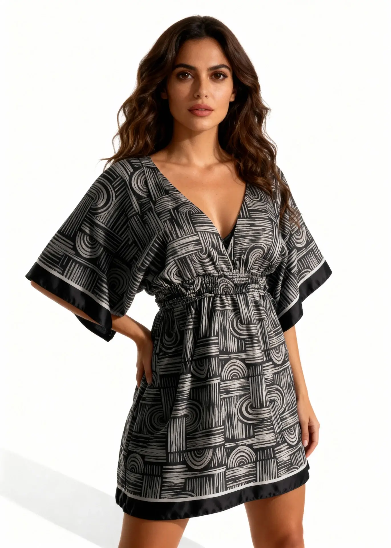 Ten model został zaprojektowany z myślą o maksymalnym komforcie w upalne dni. Szybkoschnący, kryjący materiał typu satyna Armani przyjemnie układa się na ciele i sprawia, że narzutkę łatwo założysz także na wilgotną skórę. To praktyczne rozwiązanie, które docenisz po wyjściu z wody, kiedy chcesz szybko przejść z plaży lub basenu do hotelowego baru, restauracji czy na spacer promenadą bez potrzeby całkowitej zmiany stylizacji.