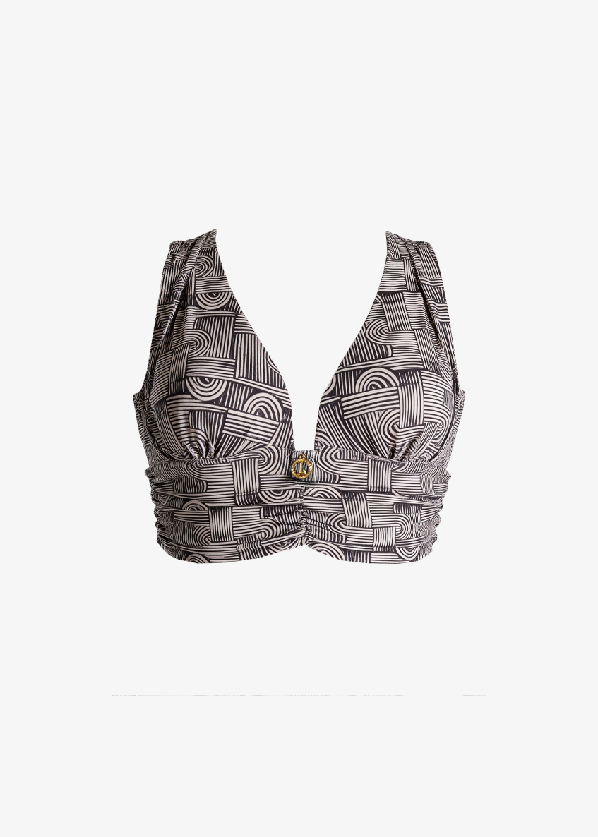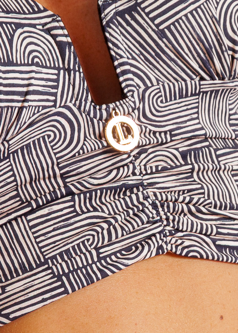Góra bikini LB-029-158 z kolekcji Fiji Paradise to model dla kobiet, które lubią połączenie zmysłowego fasonu z wygodą i naturalnym podtrzymaniem biustu. Przyciągający wzrok print w odcieniach czerni i ecru nadaje całości elegancki, nowoczesny charakter, a głęboki dekolt pięknie eksponuje górną linię sylwetki. To biustonosz kąpielowy, który świetnie wygląda solo, ale równie dobrze tworzy spójny komplet z dołem bikini i dodatkami plażowymi z tej samej kolekcji.